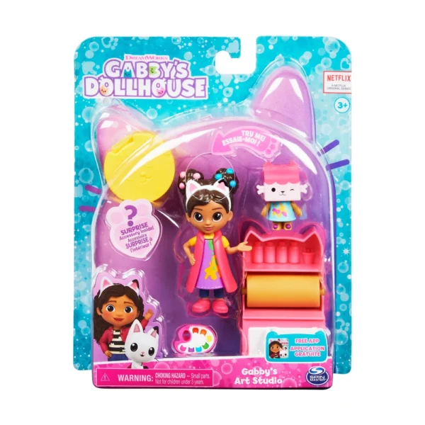 Gabby’s Dollhouse Umjetnički studio Cat-tivity set dio je maštovite linije dječjih igračaka napravljenih prema popularnoj Netflix animiranoj seriji. Tko je Gabby? Radnja prati avanture djevojčice Gabby koja se uz pomoć magičnih ušiju pretvara u animirani lik. Tako postaje dio svijeta šarenih mačjih likova koji obitavaju u njenoj kući lutaka. Gabby je pametna, pozitivna i vesela djevojčica. Uvijek pomaže svojim omiljenim macama prolaziti kroz razne izazove. Svladavanje emocija, novih vještina te izazovnih životnih iskustava Gabby sa svojim macama uspješno svladava. Zabava, tuga, bol, uspjeh i neuspjeh – svi ti trenutci dio su života svakog djeteta. Gabby s njenim prijateljima pristupa tematici lagano i probavljivo.