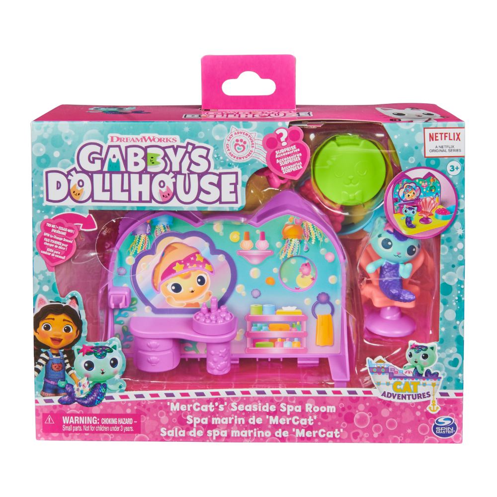 Set za igru Spa na moru sadrži novu varijantu sobe sa zabavnim dodacima koji će te odvesti na nezaboravno putovanje u fantastičan svijet Gabby’s Dollhouse! Okupaj MerCat u pjenušavoj kupki, posjedni je na stolicu pred ogledalo i pomozi joj da zablista. Svakako iskoristi sušilo za kosu! U setu te čeka i paket za dostavu koji krije posebno iznenađenje u Gabby’s Dollhouse aplikaciji (dostupna na Google Play Storeu i Apple Storeu).