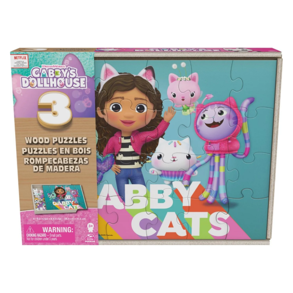 Gabby’s Dollhouse igračke drvene puzzle 3pk dio je maštovite linije Gabby’s Dollhouse dječjih igračaka napravljenih prema popularnoj Netflix animiranoj seriji. Tko je Gabby? Radnja prati avanture djevojčice Gabby koja se uz pomoć magičnih ušiju pretvara u animirani lik. Tako postaje dio svijeta šarenih mačjih likova koji obitavaju u njenoj kući lutaka. Gabby je pametna, pozitivna i vesela djevojčica. Uvijek pomaže svojim omiljenim macama prolaziti kroz razne izazove. Svladavanje emocija, novih vještina te izazovnih životnih iskustava Gabby sa svojim macama uspješno svladava. Zabava, tuga, bol, uspjeh i neuspjeh – svi ti trenutci dio su života svakog djeteta. Gabby s njenim prijateljima pristupa tematici lagano i probavljivo.