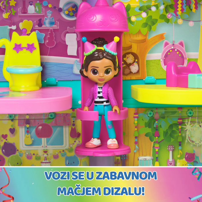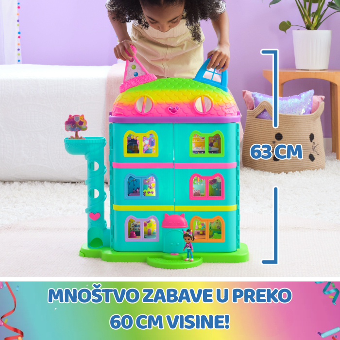Kuća je ukrašena prepoznatljivim, veselim duginim bojama koje su krasile i Gabbyinu rođendansku proslavu. Unutar kuće visoke čak 63 cm smješteno je šest prostorija te dodatni prostor skriven pod krovom – idealan za posebne zabave! Razigranu maštu dodatno će potaknuti sjajne značajke ovog seta poput legendarnog Cat-A-Vatora – mačjeg dizala kojim Gabby i njezini prijatelji putuju između katova. Osim toga, tu je i toranj za dostavu te čak dva paketića iznenađenja koje možeš otvarati baš kao Gabby u seriji.