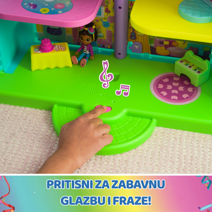 Posebna fora ove kuće za lutke je mogućnost reproduciranja zvukova i fraza iz najuzbudljivijih epizoda, čime igra postaje još živopisnija! Uz samu kuću, u pakiranju se nalazi i neodoljiva figura Gabby visine 9 cm te deset dodataka za igru – među kojima su DJ stol s klavirom, mačji WC, luk s balonima i drugi zabavni rekviziti.