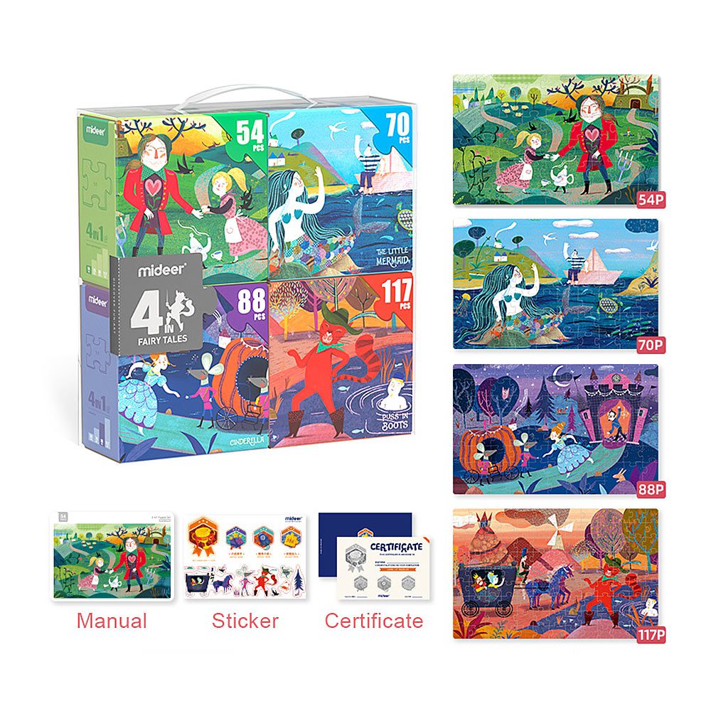 U Mideer 4u1 Bajke setu kriju se četiri prekrasne slagalice različite težine – idealne za mališane koji vole izazove i žele napredovati korak po korak.