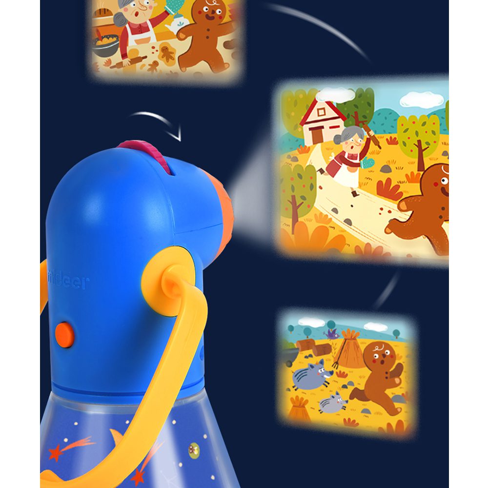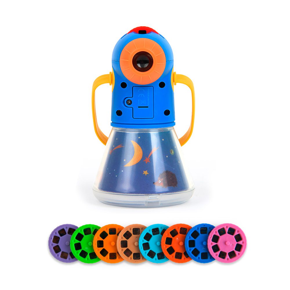 Projektor omogućuje prikaz 12 prekrasnih klasičnih bajki koje će prepoznati i roditelji iz vlastitog djetinjstva. Dovoljno je umetnuti željeni dijapozitiv i podesiti fokus ovisno o površini na kojoj projicirate – najčešće će to biti zid ili strop vaše spavaće sobe. U trenu će se običan zid pretvoriti u čarobnu pozornicu na kojoj je sve moguće… pa čak i da vuk večera s bakom i unukom!
