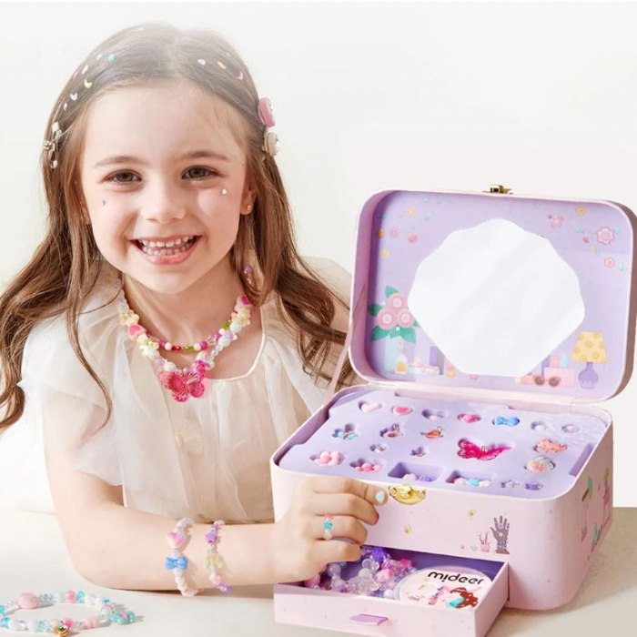 Perlice s posebnim premazom sjaje u vibrantnim bojama, a podesivi zatvarači omogućuju udobno nošenje i lako prilagođavanje veličine. Dobro organizirani pretinci čuvaju elemente urednima, a ugrađeno ogledalo i male ladice pretvaraju cijeli set u pravu mini radionicu – i kutijicu s blagom.