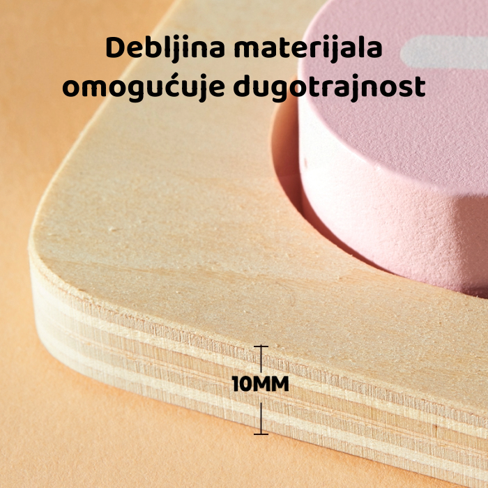 Slagalica je osmišljena prema Montessori načelima i izrađena od prirodnog drva, s bojama koje su sigurne za djecu i elementima prilagođenima malenim ručicama. Svaki broj je zaseban komad koji se može slagati, držati, uspoređivati – što potiče razvoj fine motorike, koordinacije oko–ruka i logičkog razmišljanja.