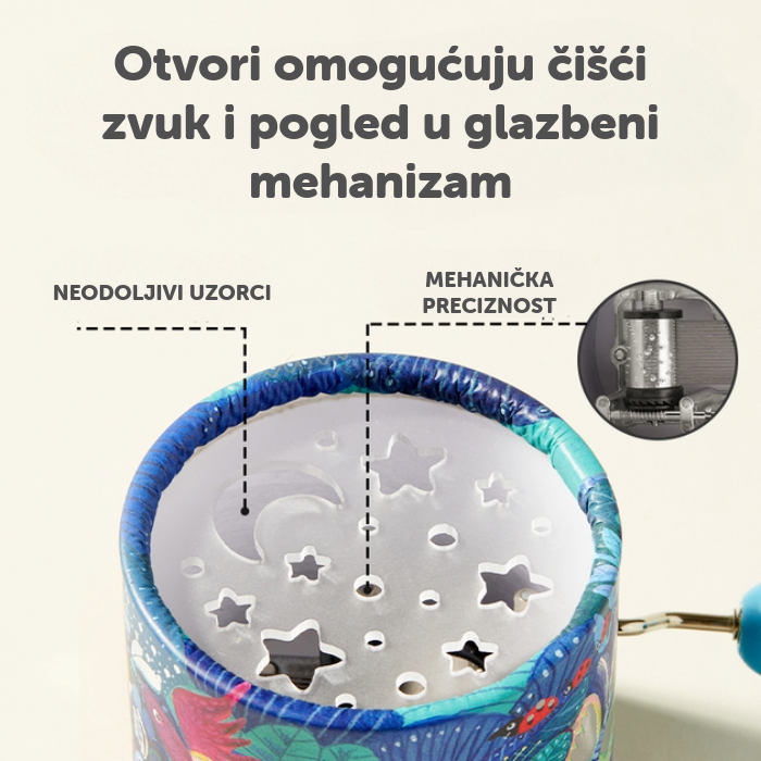 Mideer glazbena kutija na ručno navijanje pretvara svaki trenutak u čaroliju. Bez baterija i bez buke – samo tiha snaga dječje ruke i prekrasne melodije poput You Are My Sunshine, Brahmsove uspavanke, Tulips from Amsterdam i Music Box Dancer.