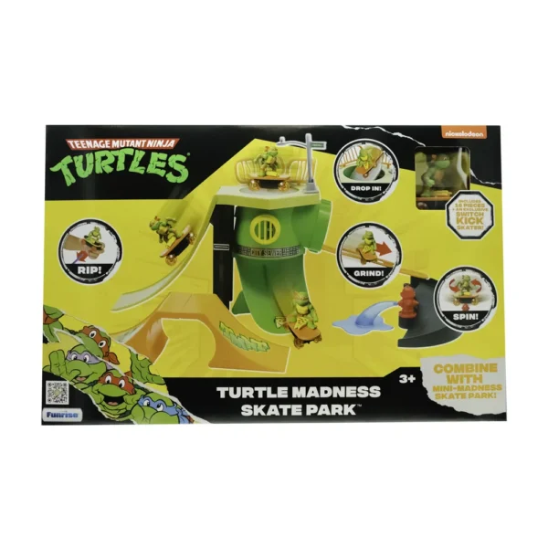 U setu se nalazi i ekskluzivna figurica Switch Kick Skater Michelangelo spremna za akciju i druženje. Uz pomoć poluge za aktivaciju skateboarda pokušaj se izvještiti u izvođenju Michelangelovih trikova kako bi pokazao sve svoje skaterske vještine. U priloženom videu provjeri kako se Turtle Madness Skate Park nadopunjuje sa Switch Kick Skater figurama i Mini Madness Skate Parkom (prodaje se odvojeno).