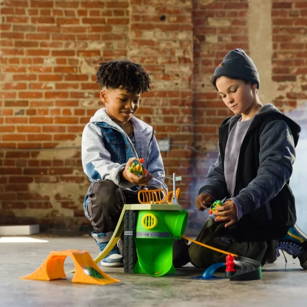 Turtle Madness set za igru sadrži sve što ti treba za gradnju vrhunskog skate parka! Sastoji se od 18 dijelova iz kojih možeš složiti nekoliko konfiguracija pa kada svladaš sve trikove na jednoj, lako presložiš dijelove seta kako bi se okušao u sasvim novim trikovima. Rampe koje ćeš složiti iz mnogobrojnih dijelova koji se nalaze u setu omogućuju ti izvođenje raznih skejterskih trikova – pojuri uz rampu, napravi salto i spusti se na drugu stranu stražnjim kotačima poput pravog profi vozača.