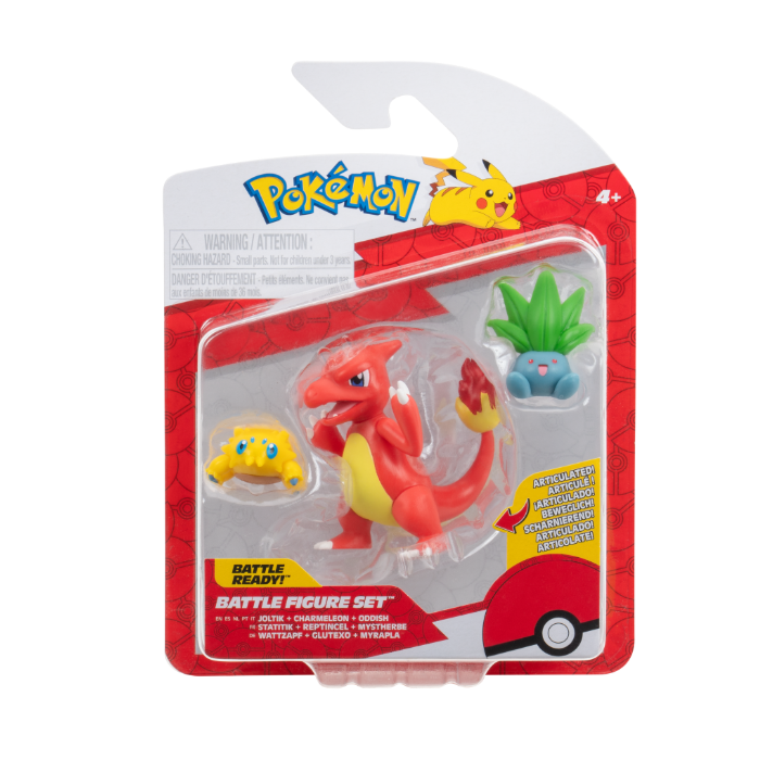 Ovaj trostruki set donosi legendarni vatreni žar, električnu energiju i biljnu čaroliju – sve u jednom pakiranju! Charmeleon ima pomične udove za akcijske poze i spreman je za borbu, dok su Joltik i Oddish savršeni za igru, razmjenu i sakupljanje.