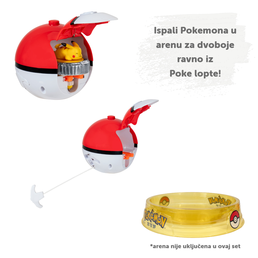 - Sadržaj: 1x figura Pikachua sa zvrkom, 1x Poke lopta za lansiranje zvrka u arenu