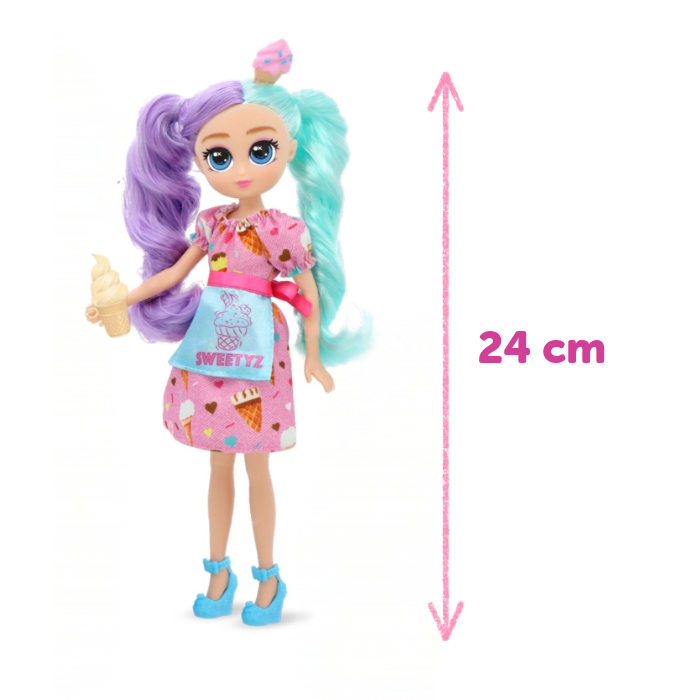 Sweetyz lutku krasi duga kosa duginih boja te pregača sa slastičarskim motivima. Uz lutku nalaze se i dodaci za igru s kojima će maštovita igra još duže potrajati.